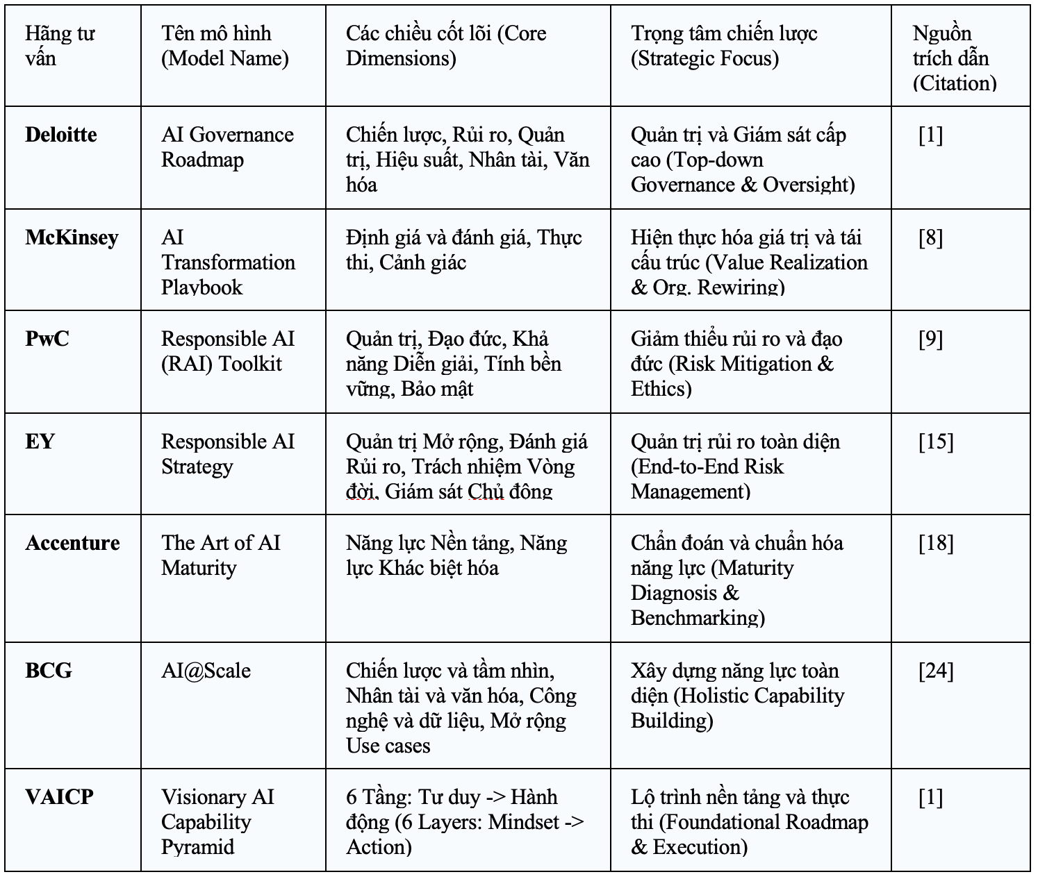 Báo cáo này tiến hành một phân tích so sánh chuyên sâu giữa các khung năng lực AI hàng đầu - bao gồm Deloitte, McKinsey, PwC, EY, Accenture và BCG - với mô hình VAICP (Visionary AI Capability Pyramid), một kiến trúc năng lực được thiết kế chuyên biệt cho bối cảnh các thị trường tiên phong như Việt Nam.