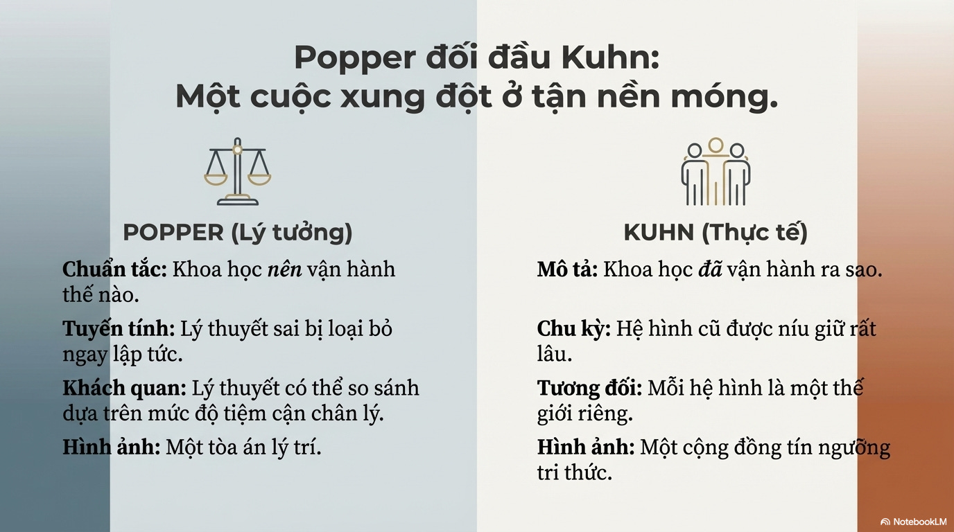Chính vì thế, tôi từng nghĩ hai ông không thể hòa giải. Một bên quá lý tưởng, một bên quá lịch sử. Một bên muốn khoa học như một tòa án lý trí, một bên lại thấy khoa học giống một cộng đồng tín ngưỡng tri thức.