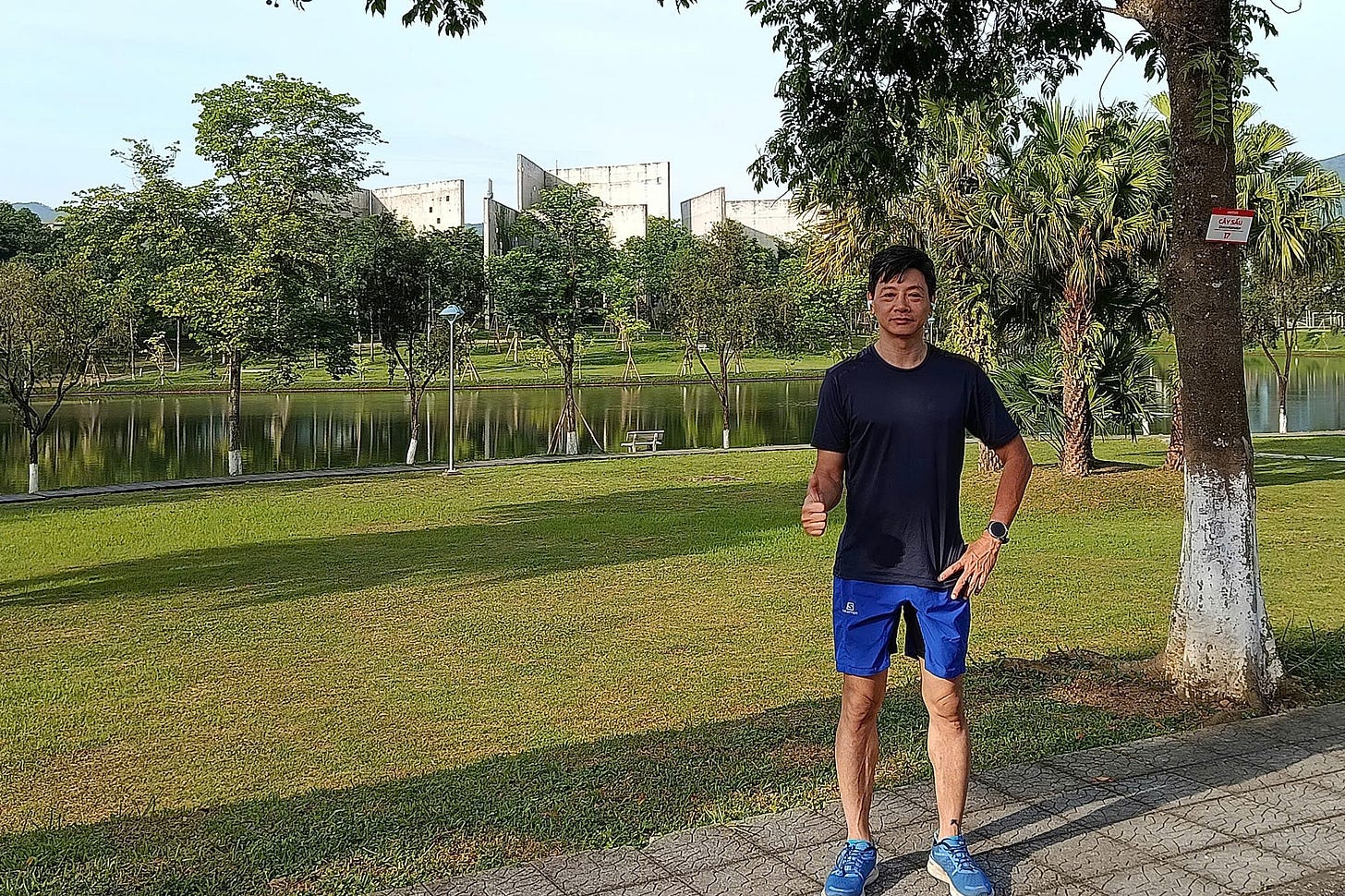Sáng nay, mặt hồ phẳng như tấm gương chưa kịp đặt một gợn ý nghĩ. Áo còn ẩm mồ hôi, đôi giày vừa dừng lại, hơi thở hạ dần từ nhịp “chiến đấu” sang nhịp “lắng đọng”. Xa kia những khối tường trắng dựng lên như các trang sổ tay chưa viết. Không xe cộ, không tiếng loa, chỉ tiếng lá lay động trước gió của "Đào hoa y cựu tiếu hạ phong".