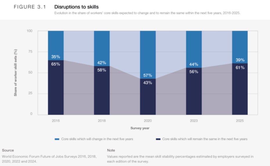 Doanh nghiệp ước tính 44 phần trăm kỹ năng của lực lượng lao động sẽ bị xáo trộn trong 5 năm, và bản cập nhật năm 2025 cho thấy 39 phần trăm kỹ năng cốt lõi sẽ đổi khác đến năm 2030. Nghĩa là ngay cả khi quỹ đạo đã “hạ nhiệt”, mức nền đứt gãy vẫn rất cao (World Economic Forum, 2023).