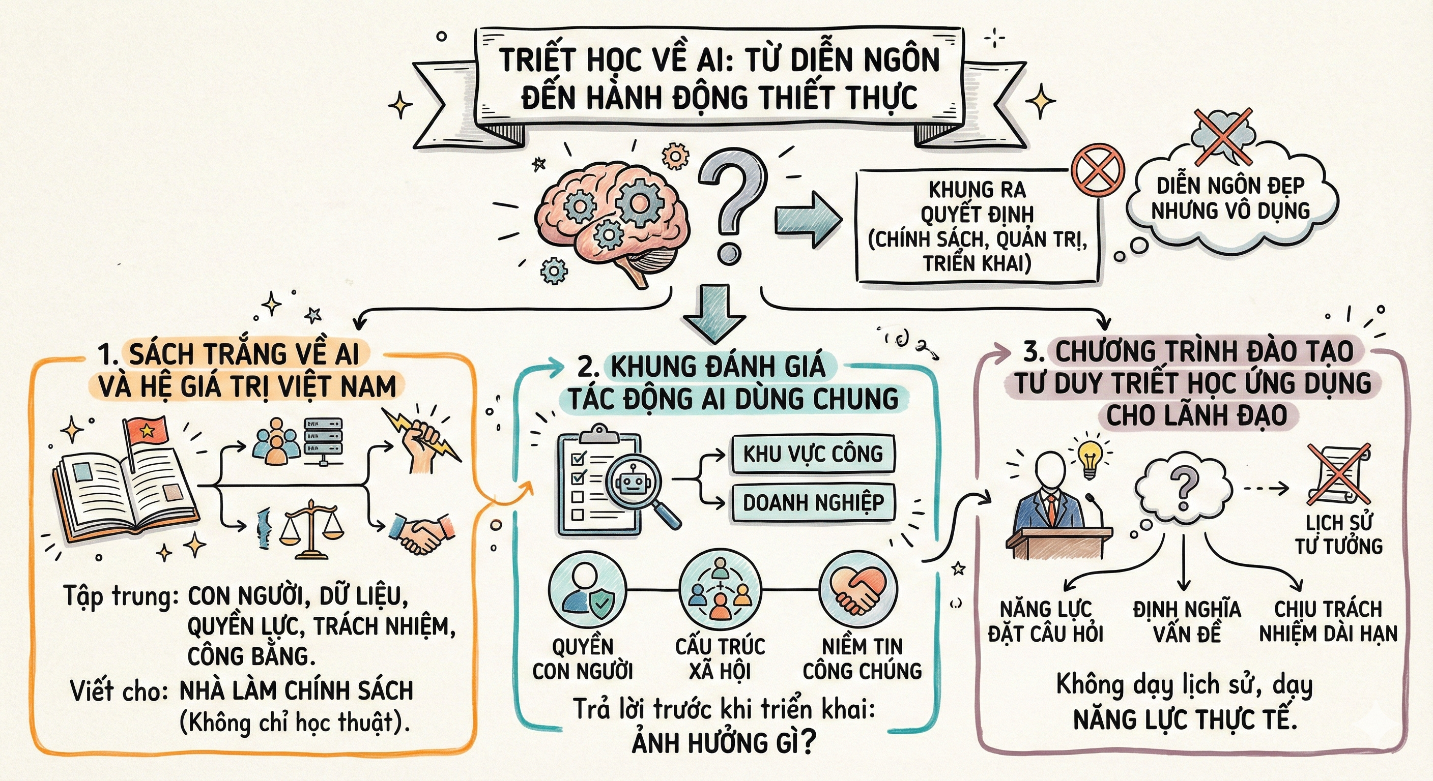 Vì vậy, thay vì hỏi “có nên có triết học về AI hay không?”, tôi cho rằng câu hỏi đúng hơn là làm thế nào để các nền tảng tư tưởng, tri thức đặc thù Việt Nam trở thành một phần của chuỗi ra quyết định về AI tại Việt Nam.